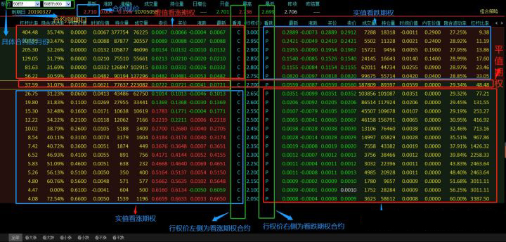 如图中所示,目标合约为50ETF1903合约,此时标的价格为2.71,行权价左侧为看涨期权,右侧为看跌期权,行权价2.7的看涨看跌期权为平值合约。此时行权价在2.7上方的看涨期权合约为虚值合约、行权价在2.7上方的看跌期权合约为实值合约、行权价在2.7元下方的看涨期权合约为实值合约、行权价在2.7元下方的看跌期权合约为虚值合约。