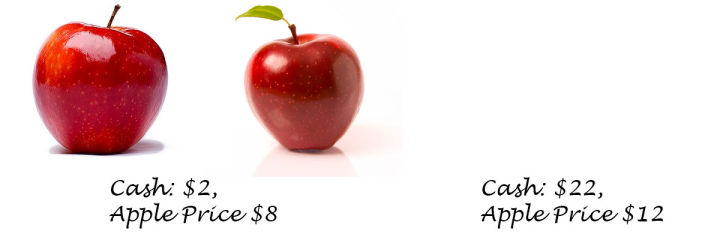 这样你左手有两个苹果,2元现金,右手没有苹果,22元现金