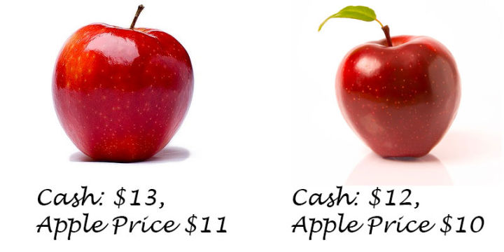 左手卖出两个苹果中的一个,剩一个苹果,现金13元,右手买入一个苹果,剩一个苹果,现金12元