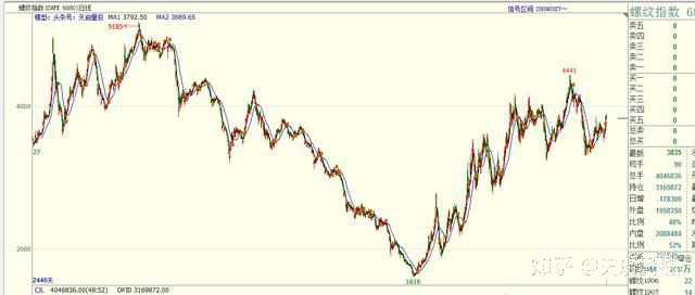 也就是说,因为任何周期面临的都是未来的不确定,所以,任何周期,任何周期的错综复杂的组合都无法生成更多的优势。所以,就没有更好的周期一说。那么,不同的周期代表了什么?我们直接用一套策略来测试一下。我选择螺纹钢期货,调出螺纹钢的15分钟K线。直接一套交易策略加上去: