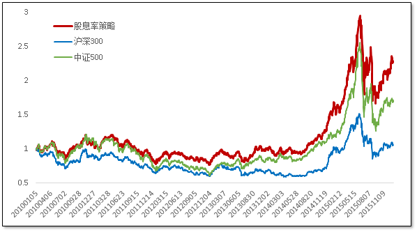 让我们看看笔者非常认同也非常喜欢的一个策略——高股息率选股策略:在每个时间T,选择前12个月的累计现金股息,相对当前股价的股息率,最高的30只股票,等权重持有一个月,并按月换仓。测试时间2009-12-31至2015-12-31。
