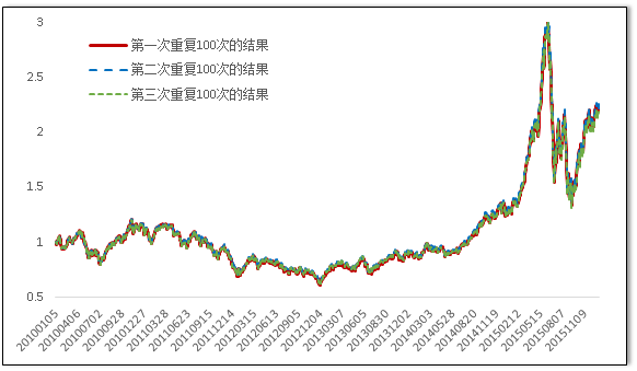 首先,我们需要看看100只大猩猩的平均值是否具有比较高的代表性,因此我们重复了上述试验结果三次,得到了下图中的三条业绩曲线。可以看到,三条曲线基本重合,这意味着100只大猩猩的平均结果就比较具有代表性了。