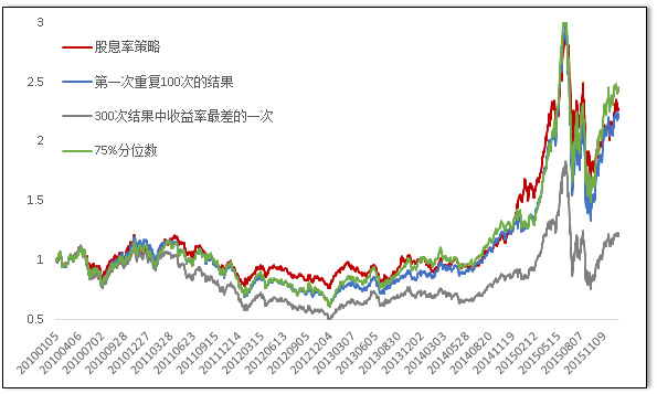 从上图中,我们看到股息率策略似乎与投资100位大猩猩的差异就没有那么明显了,第一次100位大猩猩的平均投资结果为:年化收益率14%,夏普比率0.46;而300次单次的测试结果中75%分位数表现更好:年化收益率15.9%,夏普比率0.52。有趣的是,从过去6年的结果上来看,300只大猩猩中最差的一只也优于沪深300指数,其业绩为:年化收益率3.2%,夏普比率0.10。可见沪深300是非常弱的一个指数。