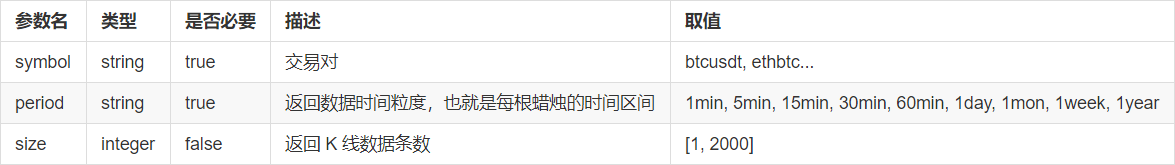 为了让策略尽快进行运作,可以自己封装一个函数,直接访问交易所K线接口,指定参数获取更多的K线数据。以火币币币交易 BTC_USDT 交易对为例,我们实现这个需求:找到交易所的API文档,查看K线接口描述: