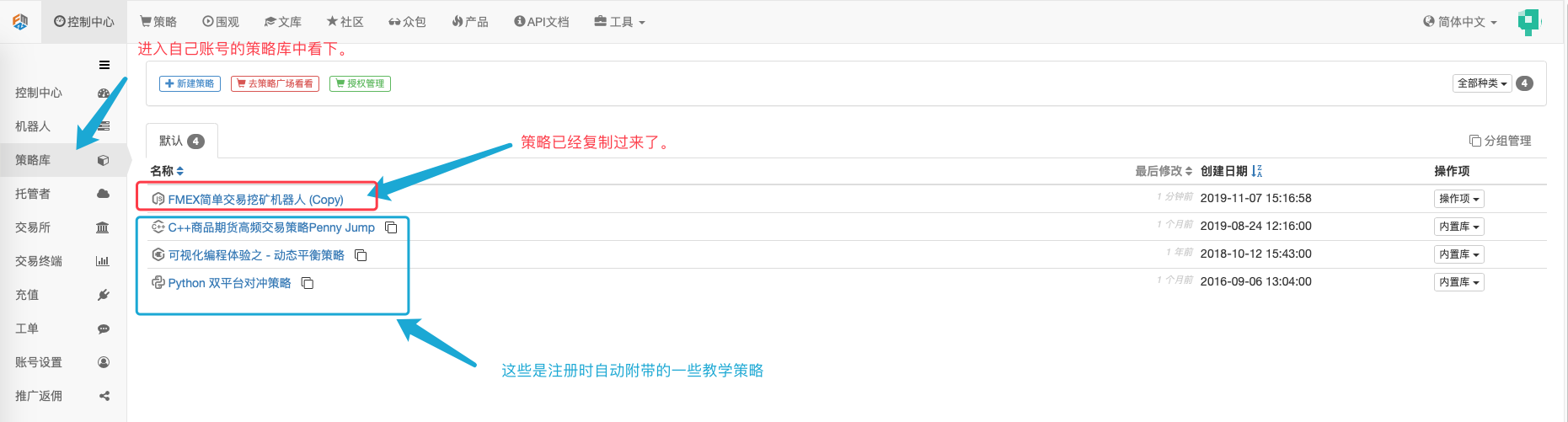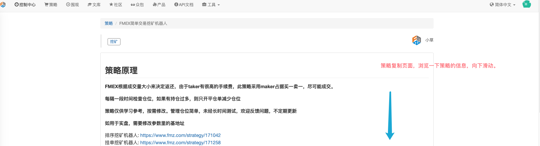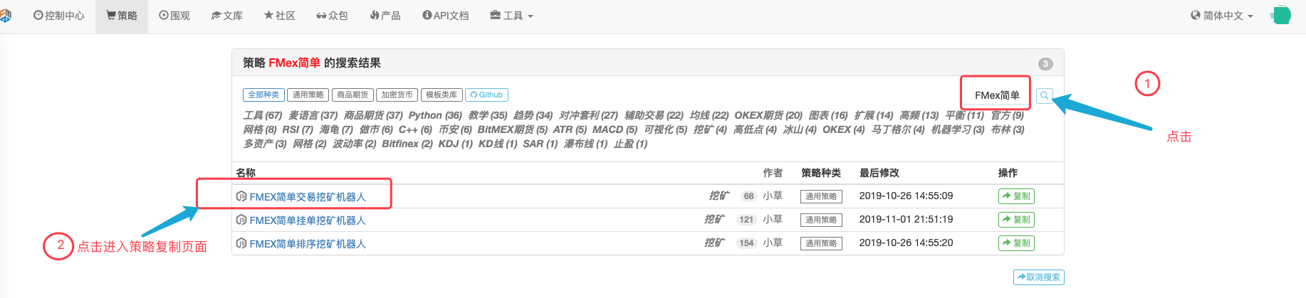 点击策略,跳转至策略广场页面,搜索「FMex简单」关键字,点击策略名称,进入策略复制页面。
