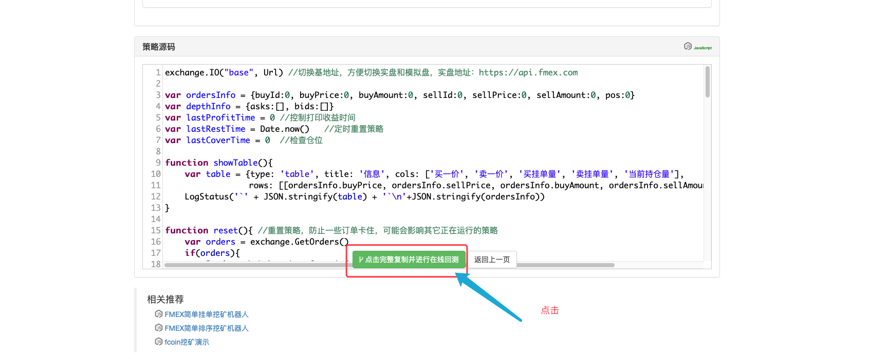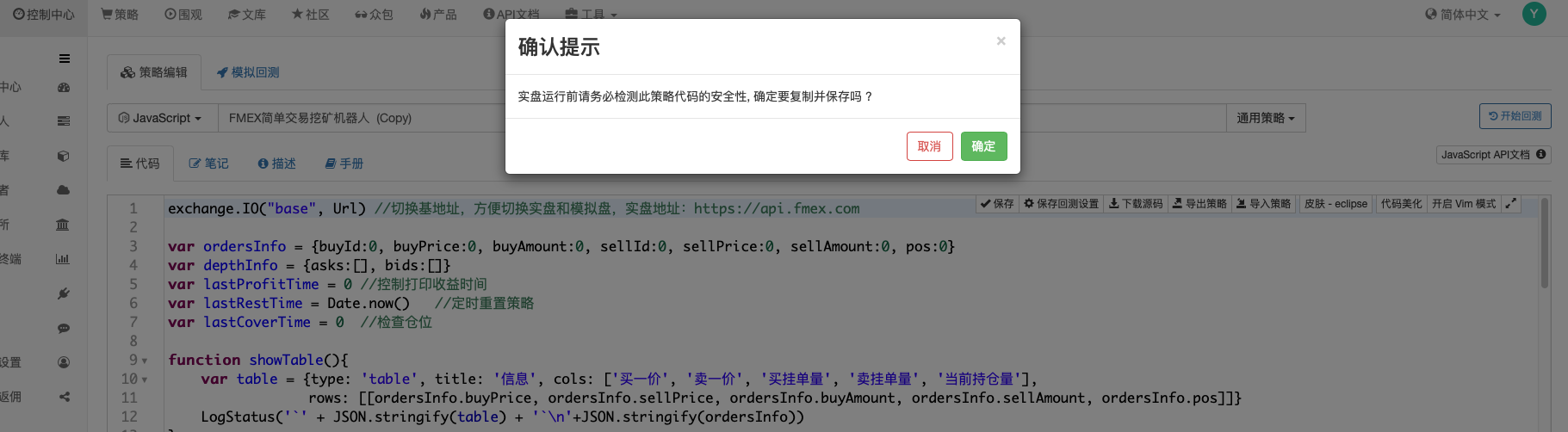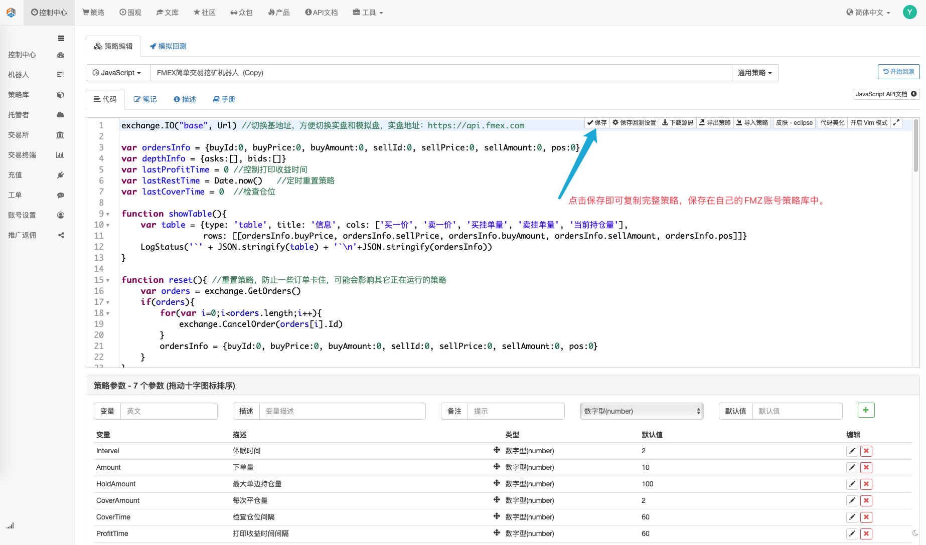 跳转至策略回测页面后,点击保存,保存完整策略到自己的FMZ账号策略库中。