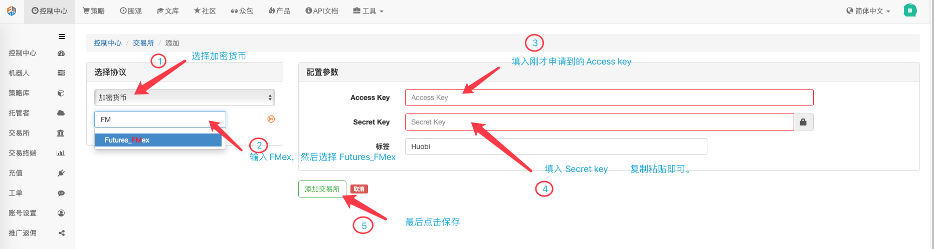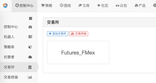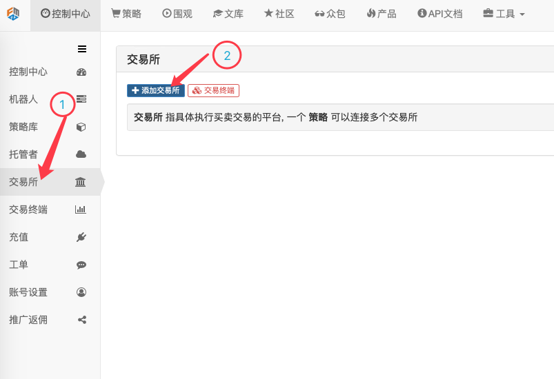 回到发明者量化交易平台的「控制中心」,点击「交易所」,点击「添加交易所」。
