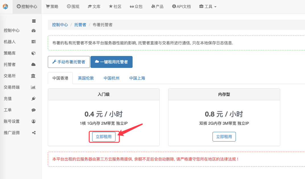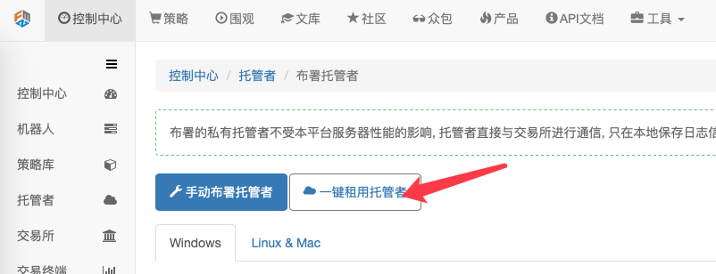 托管者部署教程: https://www.fmz.com/bbs-topic/4145#3.部署托管者 也可以使用发明者量化提供的一键部署: