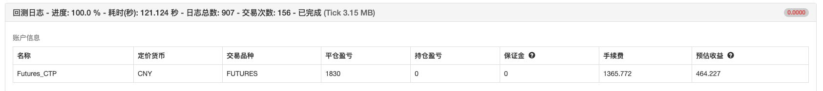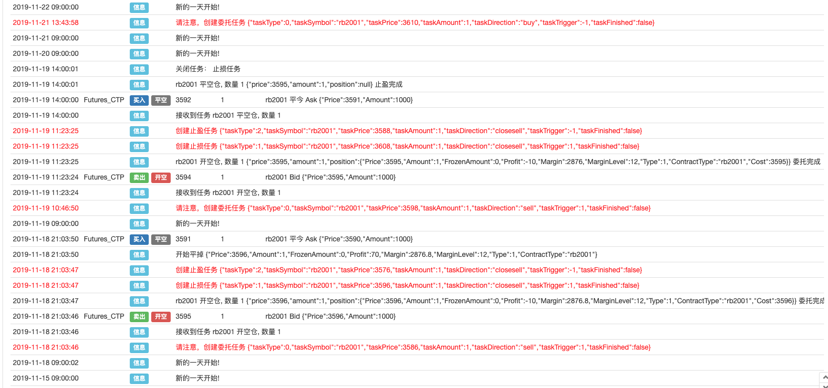 oneDayBeginTS + 1000 * 60 * 60 * 69:00开盘时间往后推移6小时,即15:00,nowTs + 1000 * 60即提前一分钟时间,当nowTs + 1000 * 60 > oneDayBeginTS + 1000 * 60 * 60 * 6条件成立,即距离收盘的时间已经小于1分钟了,开始执行平仓。得意于「商品期货交易类库」的强大功能,直接调用全平函数p.CoverAll(),即可全部平仓。商品期货交易类库不熟悉的可以看下这个类库代码,代码是开源的。