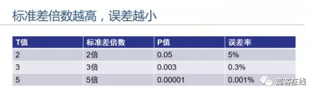 从图中,我们可以看到,如果 T 值越大,P 值越小,产生的结果误差率就越小。如果 T 值是 5 倍的标准差,那么该结果的有效率为 99.999%。因此,标准差倍数越高,T值越高,统计结果就越可信。