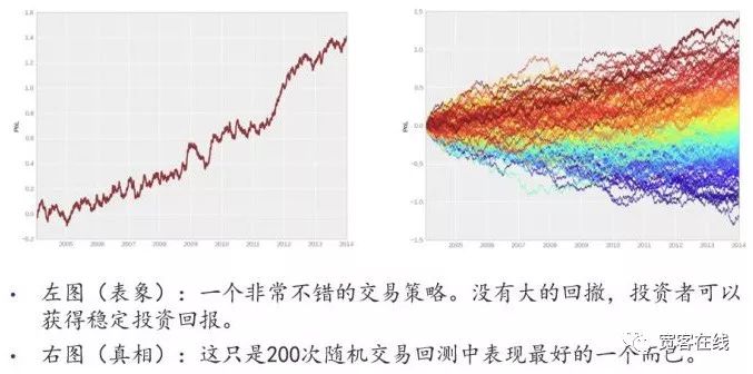 且慢,如右图所示,真实的情况就在里面。原来左边的回测曲线只是众多回测中表现最好的一只而已。也就是说在左边那个回测中,背后还有众多表现更差的情况。显而易见,未来的投资回报不可能会重复下去。