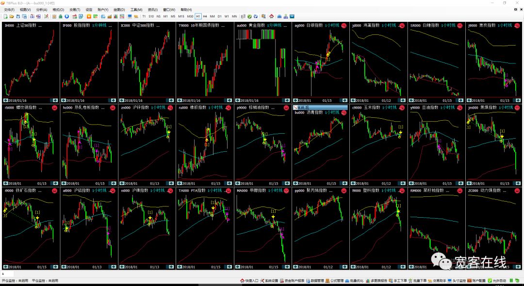 接下来,每个品种固定一个时间周期建一个图表,如果你的电脑够配置不是太差,你可以各建十个周期,分别是:5分钟、10分钟、15分钟、30分钟、45分钟、60分钟、2小时、3小时、4小时、日线,并且把每个时间周期保存成一个工作区,并且所有的图表加载一个优化过的策略。如下图的例子(只是一个工作区),就像这样: