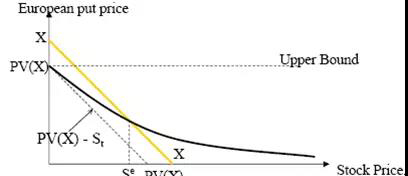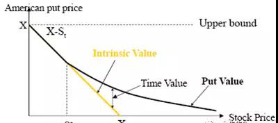 美式看跌期权的时间价值不会为负值。如上述,欧式期权时间价值可能为负,是因为老板即使不想等待,也不得不等到期权到期方可行权(由于是欧式)。而如果是美式期权,老板可以选择提前执行,于是不会出现负值。
