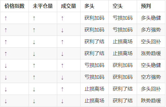 如果多空双方分歧增大,都认为价格将往自己有利的方向进行,可能都会向各自的交易方向上继续加码。反之,如果都认为行情将对于自己不利的方向发展,也都会平仓。未平仓量也会随之下降。