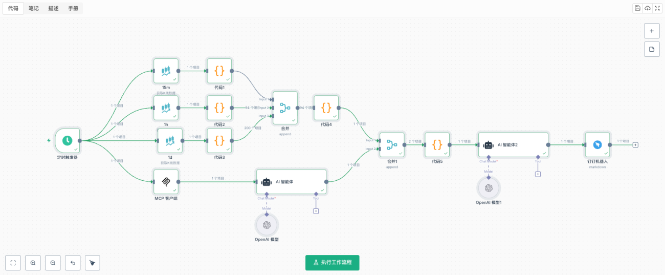 这个工作流完全基于优宽量化工作流的可视化节点搭建,无需编写复杂代码。核心思路是:数据获取 → 技术分析 → 情绪分析 → AI整合分析 → 自动化推送。整个流程通过拖拽节点、配置参数即可完成,让非技术人员也能轻松搭建专业的交易分析系统。