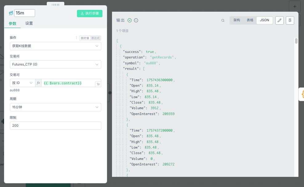 period:K线周期,15分钟(900秒)、1小时(3600秒)、1天(86400秒)limit: 200:获取200根K线,足够进行技术分析$vars.contract:使用变量存储交易合约,便于切换分析目标,作为策略外部参数,可以设置成为自己感兴趣的品种,这里我们设置今年最为火热的黄金期货品种au888以下三个代码块分别处理不同时间框架的K线数据: