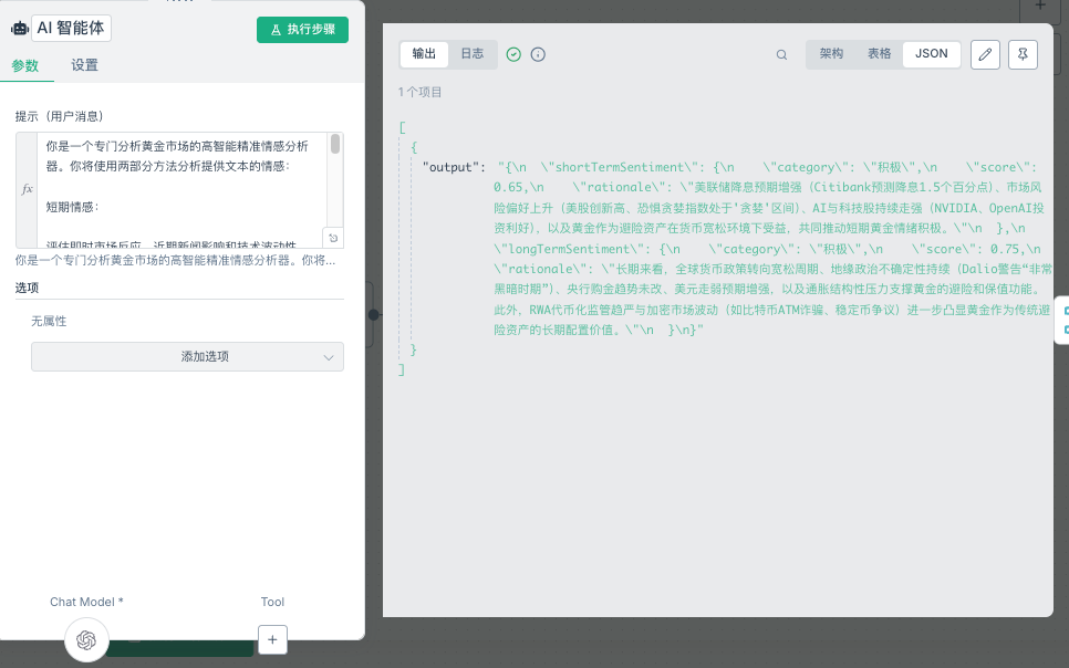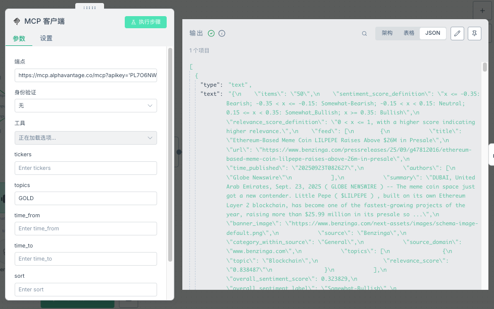 endpointUrl:Alpha Vantage的MCP服务端点,需要在其网站申请API密钥tool:使用NEWS_SENTIMENT工具获取新闻情绪数据topics:指定主题为"GOLD",聚焦黄金市场相关新闻节点类型:AI智能体