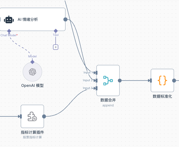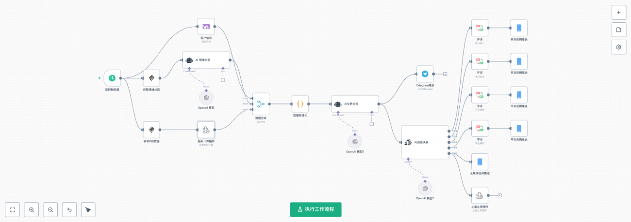 这个工作流目标是构建一个"数据采集→AI分析→自动交易"的完整链条,让AI根据技术指标和市场情绪自动做出交易决策。