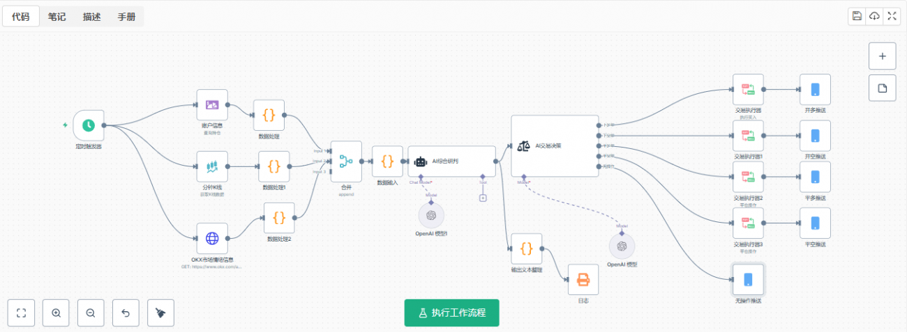 该示范工作流通过定时触发器每10分钟自动获取账户持仓、K线行情和市场情绪数据,经过数据处理和合并后,由AI综合研判节点使用Claude模型进行技术分析,然后通过AI交易决策节点将分析结果转化为具体交易指令,最终由对应的交易执行器自动执行交易并发送推送通知,实现了从数据采集到交易执行的全自动化量化交易流程。