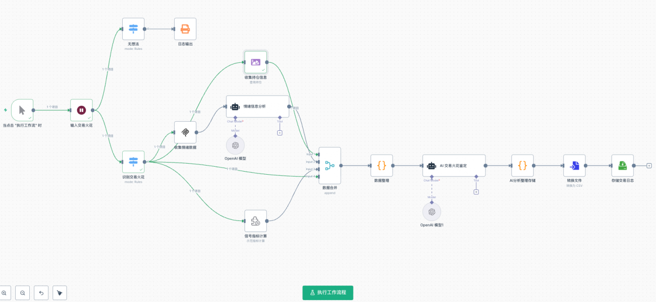 工作流触发 → 表单输入 → 空值判断 → [数据收集] → 数据整理 → AI分析 → 存储 → 导出CSV