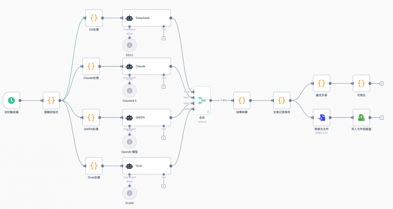 这个想法听起来有点疯狂,但仔细想想却很有道理。传统的量化策略往往依赖单一的逻辑框架,而AI模型的多样性为我们提供了新的可能性。利用发明者量化交易平台的工作流的自动化工具,我们就把这个想法进行了实现,构建出了这套完整的"AI窝里斗交易系统"。