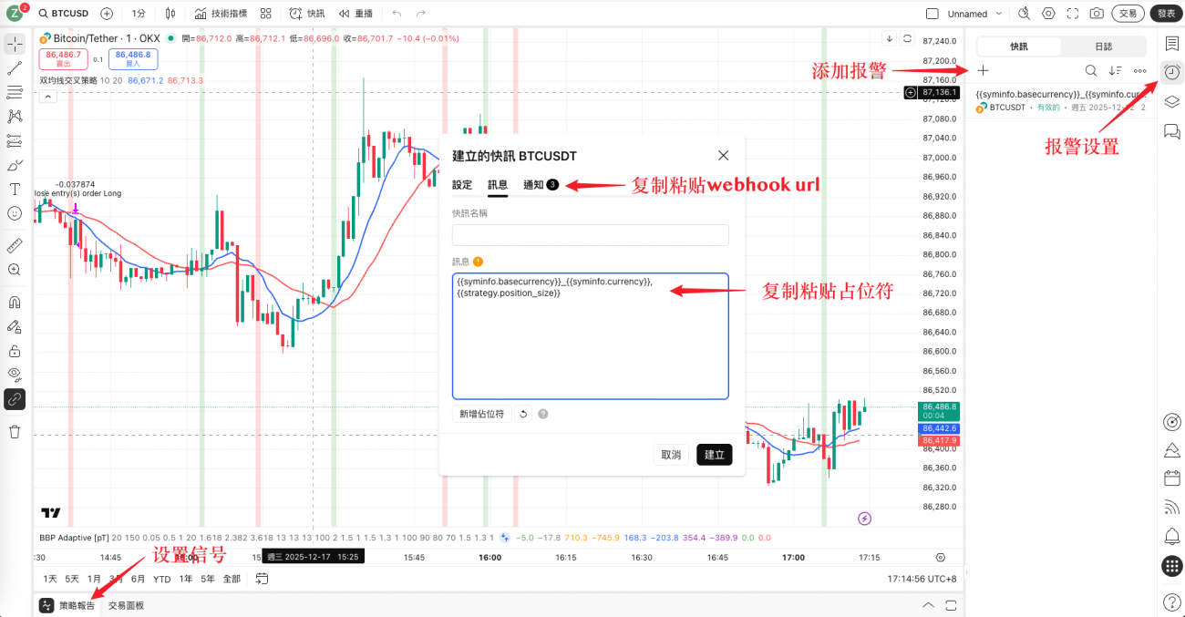 TradingView那边,在策略的报警设置里把这俩填进去就完事了。