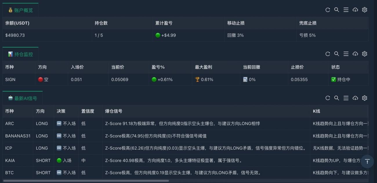 这是一次基于传统清算数据的 AI 增强探索。清算数据本身是市场最真实的反应,叠加 K 线和新闻之后,信号的可信度得到了有效提升,AI 的引入则让**度决策变得可以自动化。