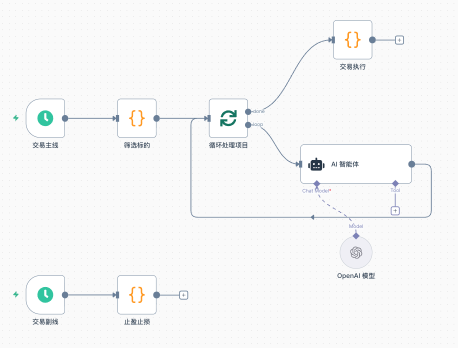 交易主线 每 10 分钟 筛选标的 → 循环处理 → AI 智能体 → 交易执行 寻找机会、下单建仓