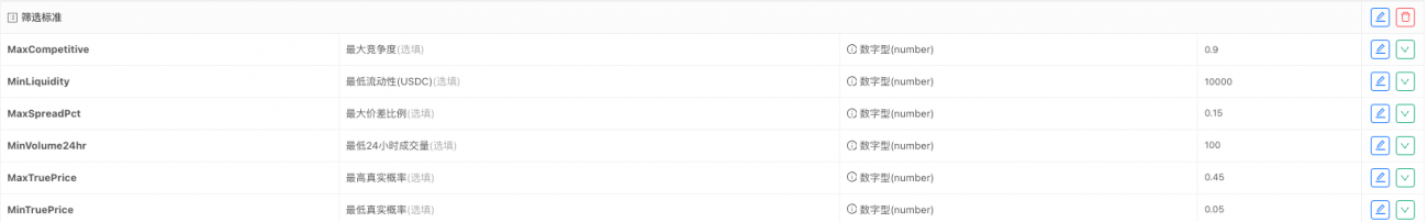 筛选条件包括:流动性下限(过低意味着买卖困难)、24 小时成交量下限(基本无人交易的标的缺乏参考价值)、买卖价差上限(价差过大意味着滑点成本高)、竞争度上限,以及价格区间——只关注市场隐含概率在 5%~50% 之间的标的。太高的已经充分定价、上涨空间有限;太低的可信度存疑,更接近彩票而非套利机会。