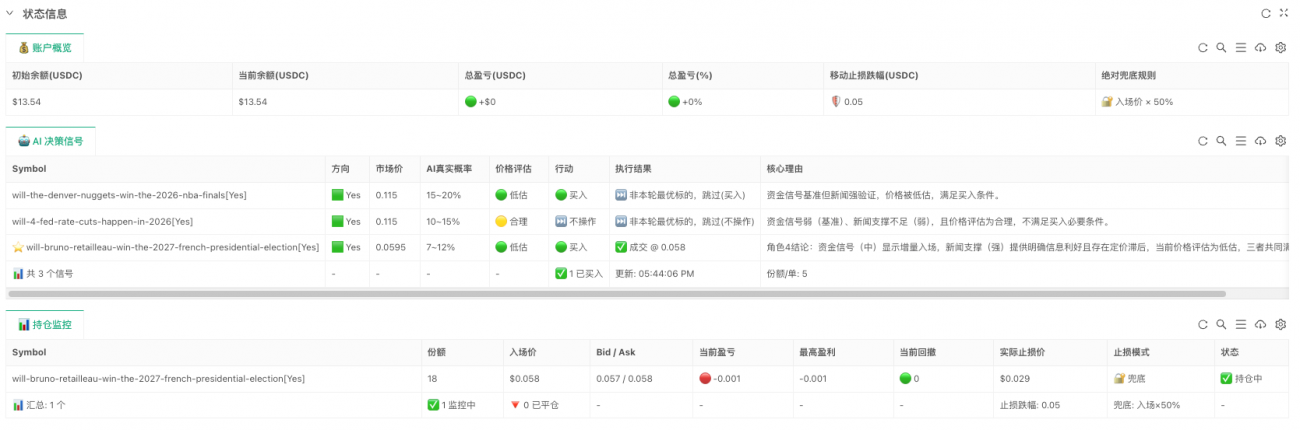 说实话,这套系统更多是一个可以跑起来的思路框架,而不是开箱即用的印钞机。核心逻辑——资金行为溯源、舆情双轨验证、多角色 AI 判断——在理念上有一定合理性,但真实市场里信号质量参差不齐,AI 的判断也会出错,临近到期的价格收敛风险始终存在。