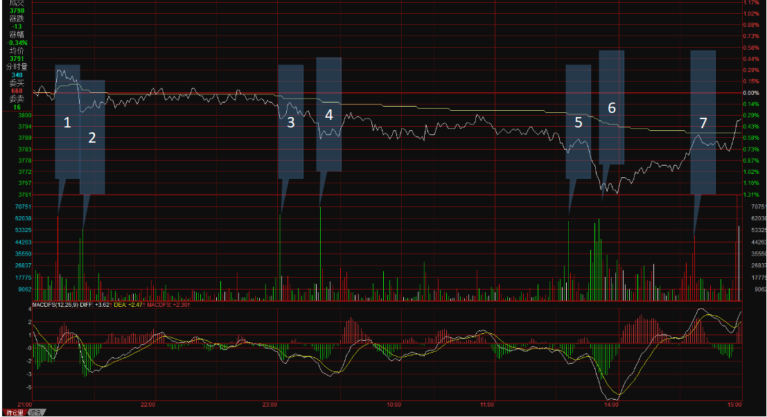 备注:第六个进场点在止盈上方可以放大利润到收盘前3766-3796 盈利30点。合计:10-20个点盈利。