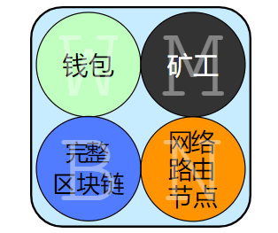 一个全功能节点包含上述4个模块【钱包Wallet】【矿工Miner】【完整区块链full Block-chain database】【网络路由节点Network routing】