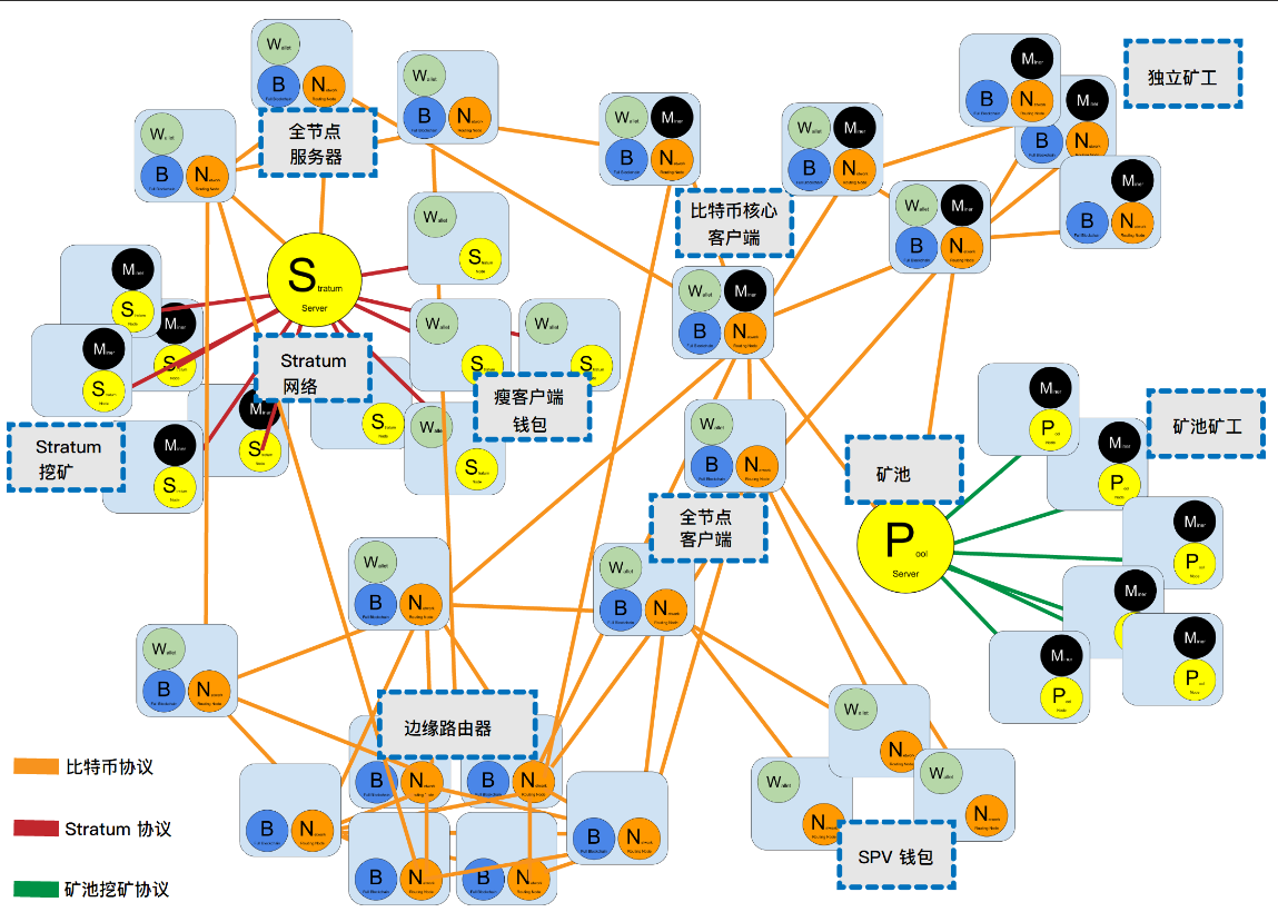 | 矿池协议服务器 | 将运行其他协议的节点,连接至P2P网络的网关路由器 | |