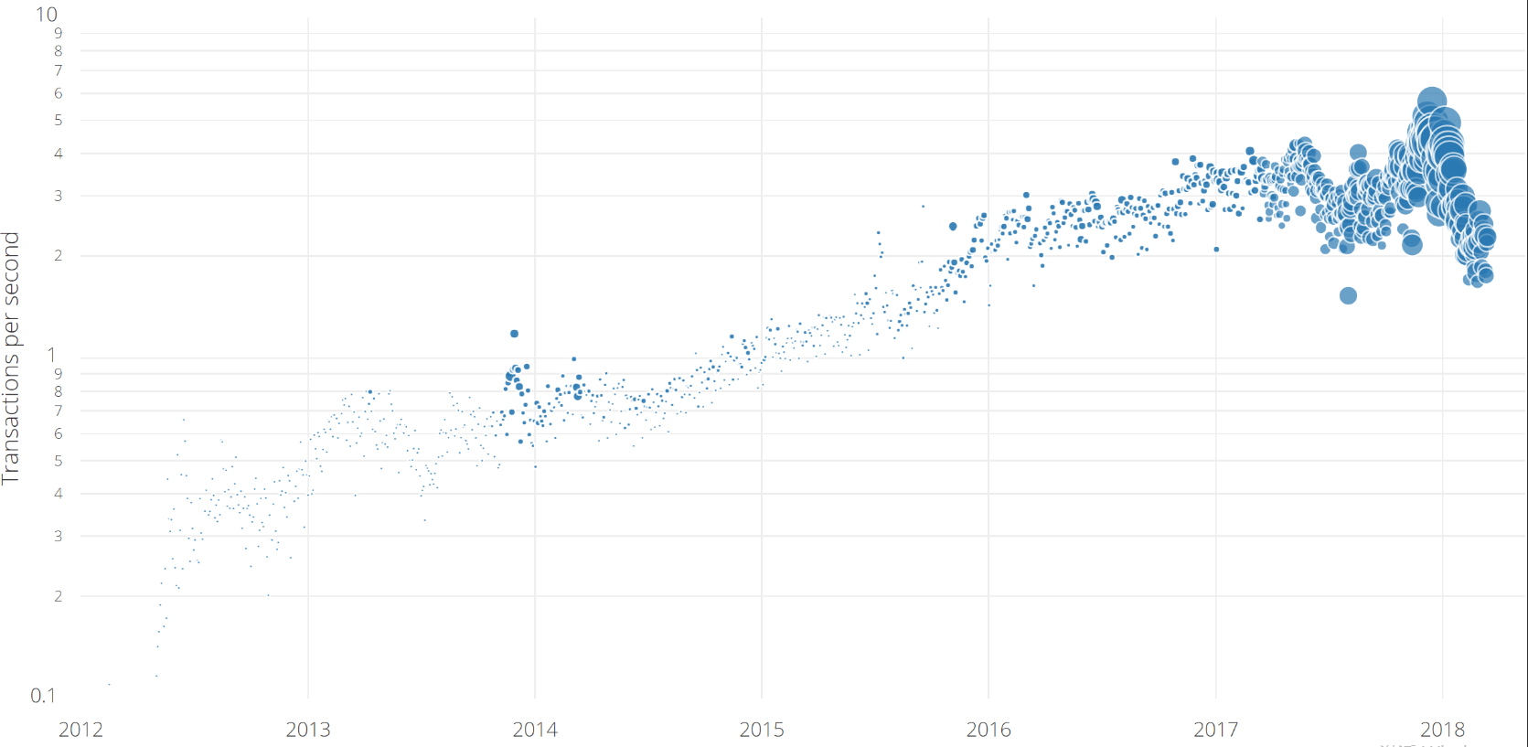 截止2018年4月1号,完整区块链大小已经有约151GB的大小了,上表中,可以观察到,1M的容量意味着比特币最大的处理交易数量在约2400(486882区块1034.39的大小很接近了),从代码及技术文档来看,一个区块的最大处理交易数量在2700笔,意味着在一定程度上区块利用率可以超过100%。下面再给出一张时间和每秒交易数量的关系图表(交互表格点击链接)