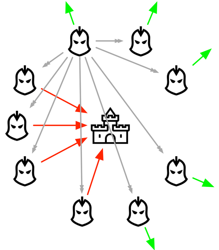 最简单的策略即:投票(上图中的红色箭头和绿色箭头为每个将军做出的判断),超过半数支持某个决定,那么所有9个将军一定执行这个决定。如上图,5个将军决定进攻,4个将军决定撤退,那么所有将军都会下令:进攻!
