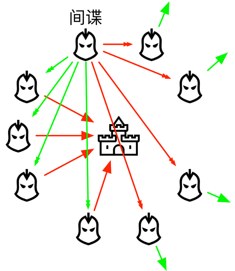 我们先假设信道一定是可靠的,传令兵死亡之类的事情我们不考虑,毕竟在一个非常复杂的网络中,还可以通过多条的方式连接任意两个节点,可靠性还是值得相信。主要破坏一致性的还是心怀不轨的【间谍】,或者总结为:如何防止【间谍】对整体决策(进攻还是撤退)进行破坏?