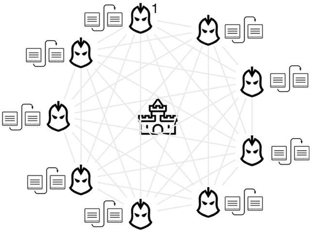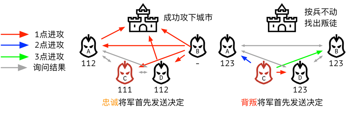 9个将军带领9支军队,打一场攻城战役。假设每个将军都能**根据眼前战况做出两种判断:进攻或撤退,要求(或者最终目的是)如何让这9个将军的命令是一致的(一致性,即共识)?要么一起进攻,要么一起撤退(每个将军之间也是互不信任的,也有消灭对方的动机);