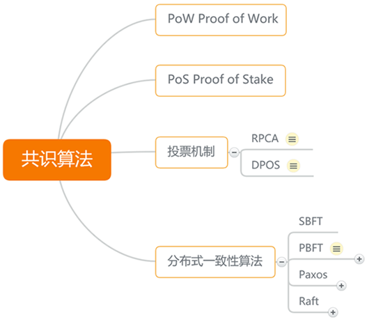 因为技术还在不断发展,可能有其他的算法被建立,但是只要谈到共识这个问题,核心一定是【中心化】和【去中心化】的权衡(Trade-off),而对应的就是效率,可以这么说,一致(信任)是需要成本的,这是本源法则,和线性向量空间的定义处在同一个层级。中本聪很厉害的地方就在于,之前的分布式一致性算法(PBFT)对大体谅节点系统的支持非常差,效率上来说,基本和无法实现是等等同的,下面的思维导图展示了现在基本的区块链共识算法总结: