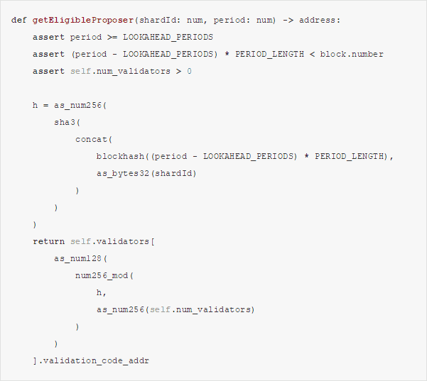 getEligibleProposer(uint256 shardId, uint256 period) returns address :使用一个区块哈希(block hash)作为种子基于预设的算法从验证器集合中选择一个签名者(signer)。验证器被选中几率应该与其存款数量成正比。这个函数应该可以返回一个当前周期内的值或者以 LOOKAHEAD_PERIODS 为上限的任意未来周期内的值。