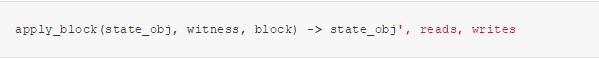 这里, state_obj 是一个数据元组,包含了状态根和其他 O(1) 大小的状态数据(使用的gas、receipts、bloom filter等等); witness 就是见证人; block 就是区块的余下部分。其返回的输出是: