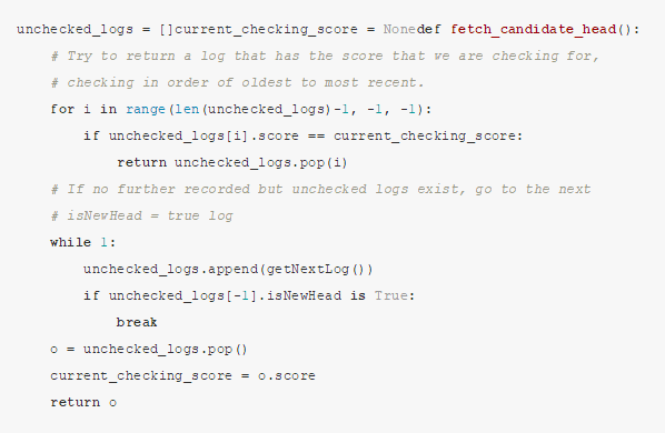 为了实现监视分片的算法和创建collation,我们要做的第一件事就是使用下面的算法来按由高到低的顺序匹配候选head。首先,假设存在一个(非单纯的、有状态的)方法 getNextLog() ,它可以取得某个还没有被匹配的给定分片的最新的 CollationAdded 日志。这可以通过逆向匹配最新的区块的所有日志来达成,即从head开始,反方向扫描receipt中的每个区块。我们定义一个有状态的方法 fetch_candidate_head :