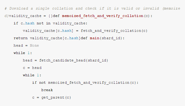 如果一个客户端在监视一个分片,它应该去尝试下载和校验那个分片中的所有collation(检查任何给定的collation,仅当其父collation已经被校验过)。要取得head,需要持续调用 fetch_candidate_head() ,直到它返回一个被校验过的collation,也就是head。通常情况下它会立即返回一个有效的collation,或者最多因为网络延迟或小规模的攻击导致生成过几个无效或者不可用的collation,而需要稍微尝试几次。只有在遭遇一个真正长时间运行的51%攻击时,这个算法会恶化到 O(N) 的时间。