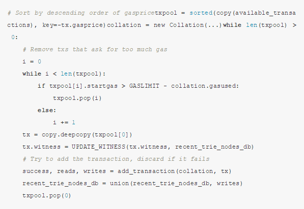 fetch_and_verify_collation(c) 包含了从分片网络取得 c 的所有数据(包括见证人信息)并校验它们的处理。上述算法等价于“选取最长有效链,尽可能的检查有效性,如果其数据无效,则转而处理已知的次长链”。这个算法应该仅当校验器执行超时时才会停止,这就是该创建collation的时候了。每个 fetch_and_verify_collation 的执行都应该返回一个“写集合”(参考上文的“无状态客户端”那节)。保存所有这些“写集合”,把它们组合在一起,就构成了recent_trie_nodes_db 。