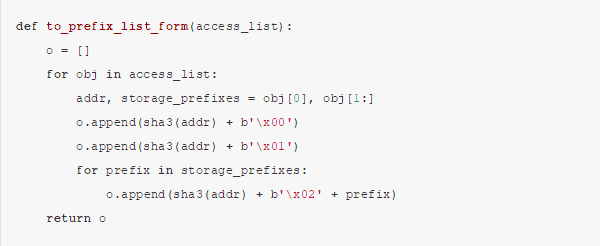 从根本上说,这意味着:“这个交易可以访问这里给定的所有账户的余额和代码,并且账户列表中给出的每个账户的前缀中至少有一个是该账户存储的一个键的前缀”。我们可以将其转换为“前缀列表格式”,基本上就是一个内部存储查找树的前缀列表(参考前面的章节):