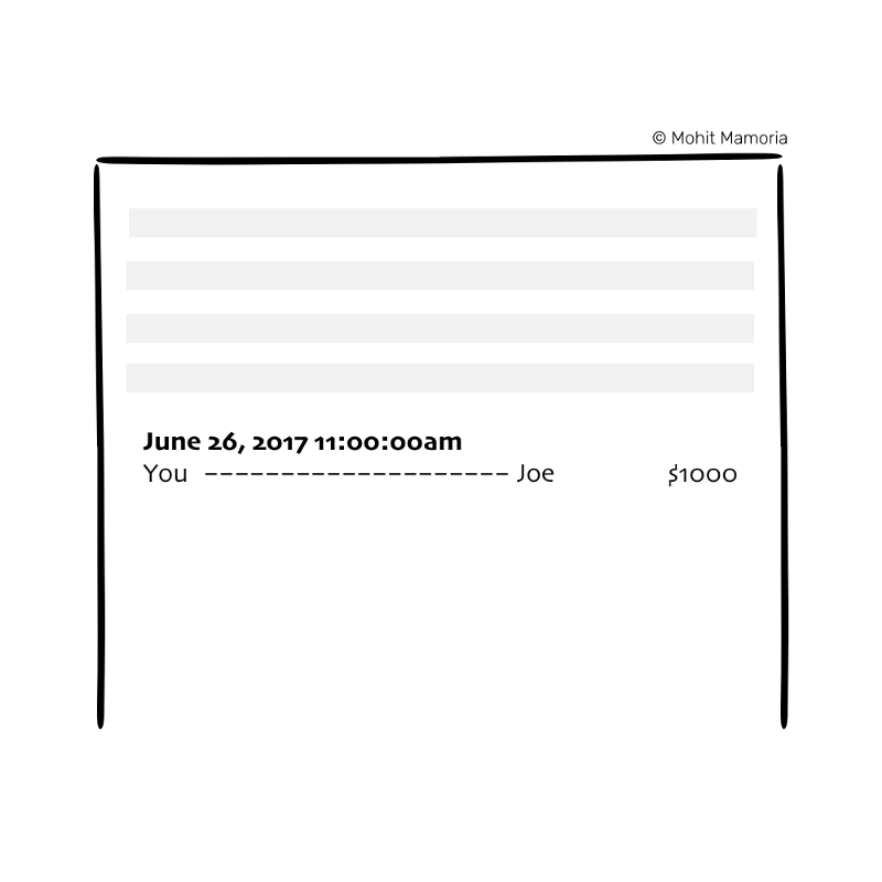 回头我们再来看看刚刚到底发生了什么。你和Joe都信任那家银行来管理你们各自的财产。整个过程中实际并没有真实货币的物理流动。整个过程只涉及录入系统的两个账户即可。更准确地说,全程只需主动权属于该银行的两个账户就可以完成。