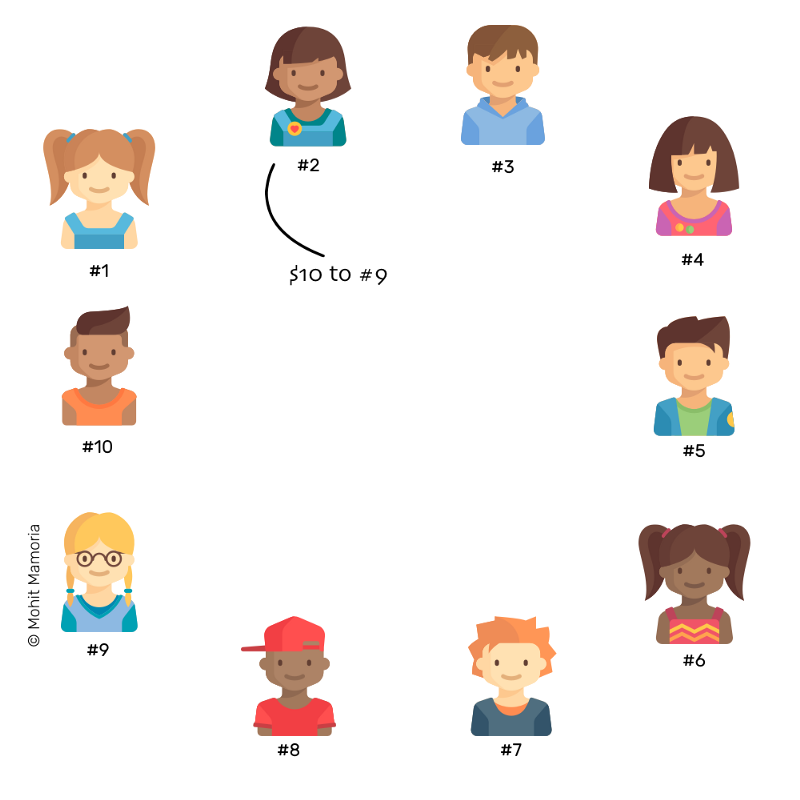 为了完成这笔交易,2号大声地告诉每个人:“我要转10美元给9号。请大家都在自己的纸上记下来。”
