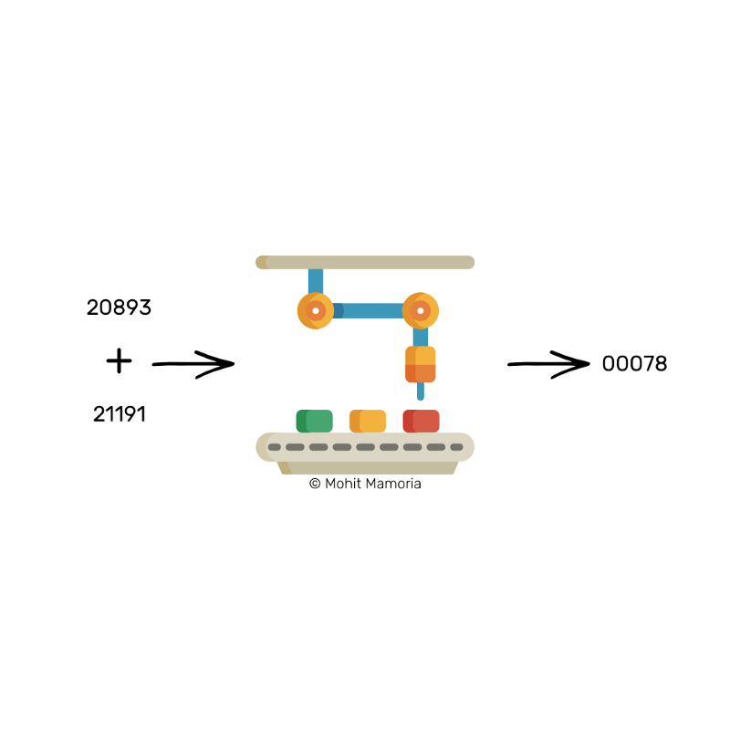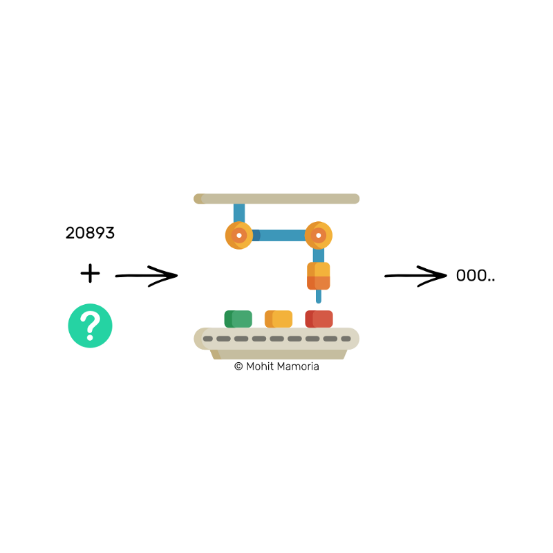 假设我给了你两个盒子。第一个盒子里面有数字20893,你能不能想出一个数字,这个数字与第一个盒子里的数字相加后的结果放入魔法机器后,我们能够得到一个以3个零为开头的字符结果。