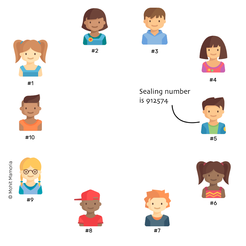 当这个页面上记不下更多的交易记录时,交易网络中的每个人都会停下来计算该页面的密封数字,然后将其放入文件夹。如果第一个人算好了密封数字,他就会向所有人公布。