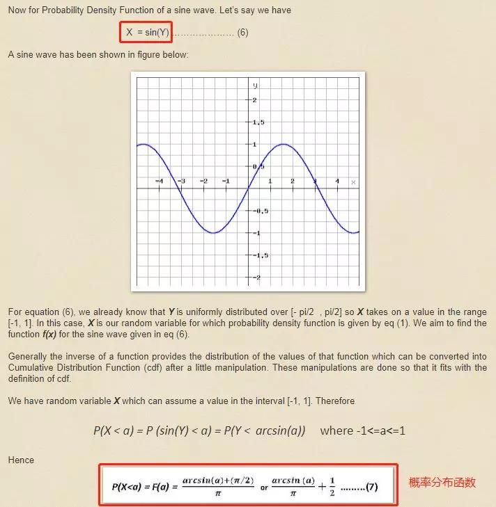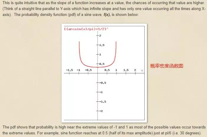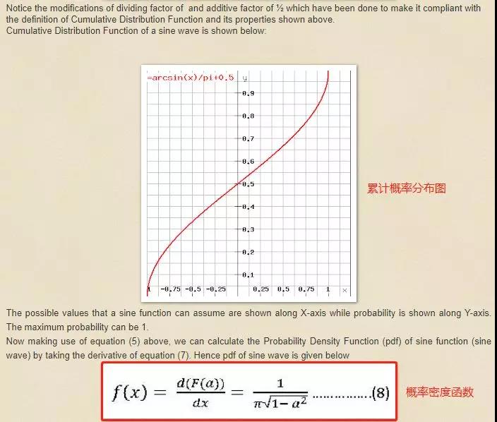 下面给出了正弦波的概率密度函数的推导过程,求得概率分布函数后求导即得概率密度函数。
