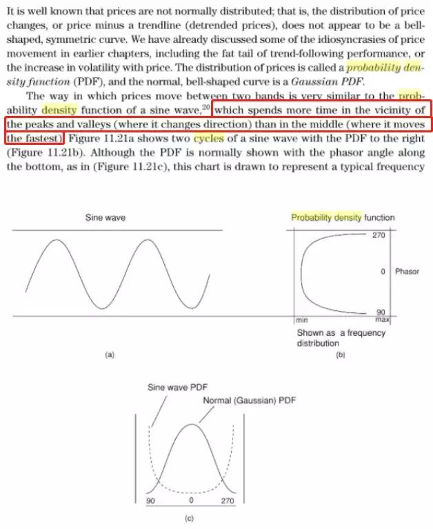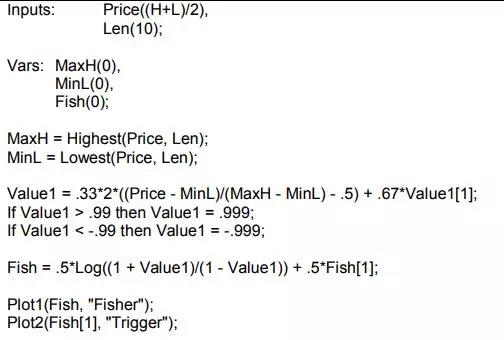 上面的公式并不是很好理解,(Price-MinL)/(MaxH-MinL)是介于(0,1)的数,减去0.5后介于(-0.5,0.5)之间,乘以2放大到(-1,1)之间,之后做平滑操作,当期相对位置即(Price-MinL)/(MaxH-MinL)给予0.33的权重,上一期的给予0.67的权重,之后即得value1,如此的移位与放缩操作并不会改变数据的本质属性,包括下面的两条if判断语句目的是限制value1介于(-1,1)之间,这么做的原因在于输入必须是介于(-1,1)的如正弦波般波动的时序,或许你会问为何如此限制,因为费舍尔变换是将正弦波的概率密度函数转换成正态分布的密度函数的。